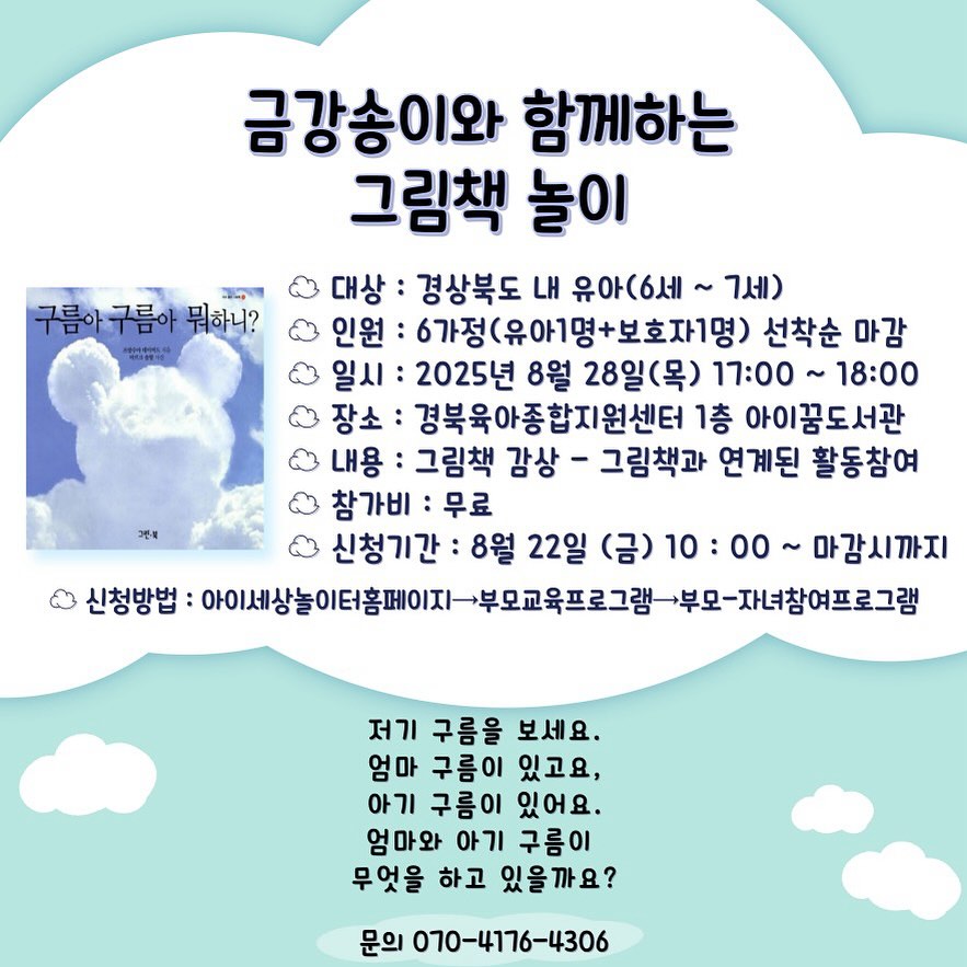 | 아이꿈도서관에서 금강송이와 함께하는 그림책 놀이를 진행합니다❤️ (3) | 2025.09.05 |