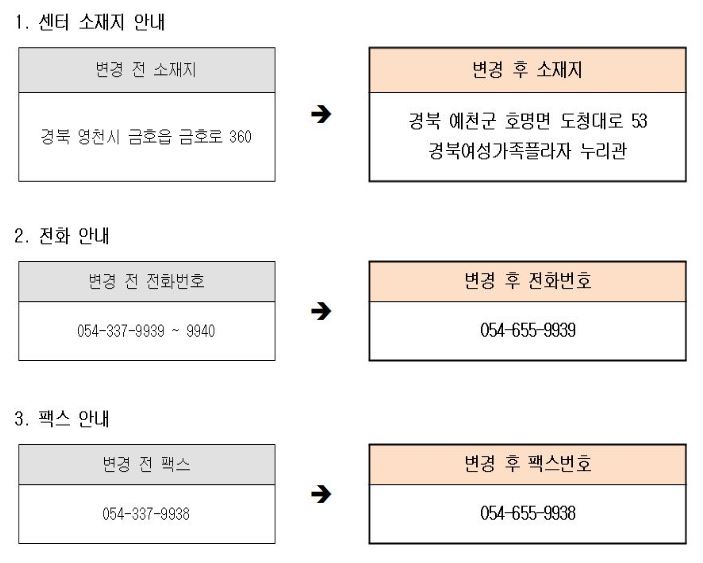 경북센터가 '영천시'에서 '예천 신도청 소재지'로 확장 이전하였습니다.
