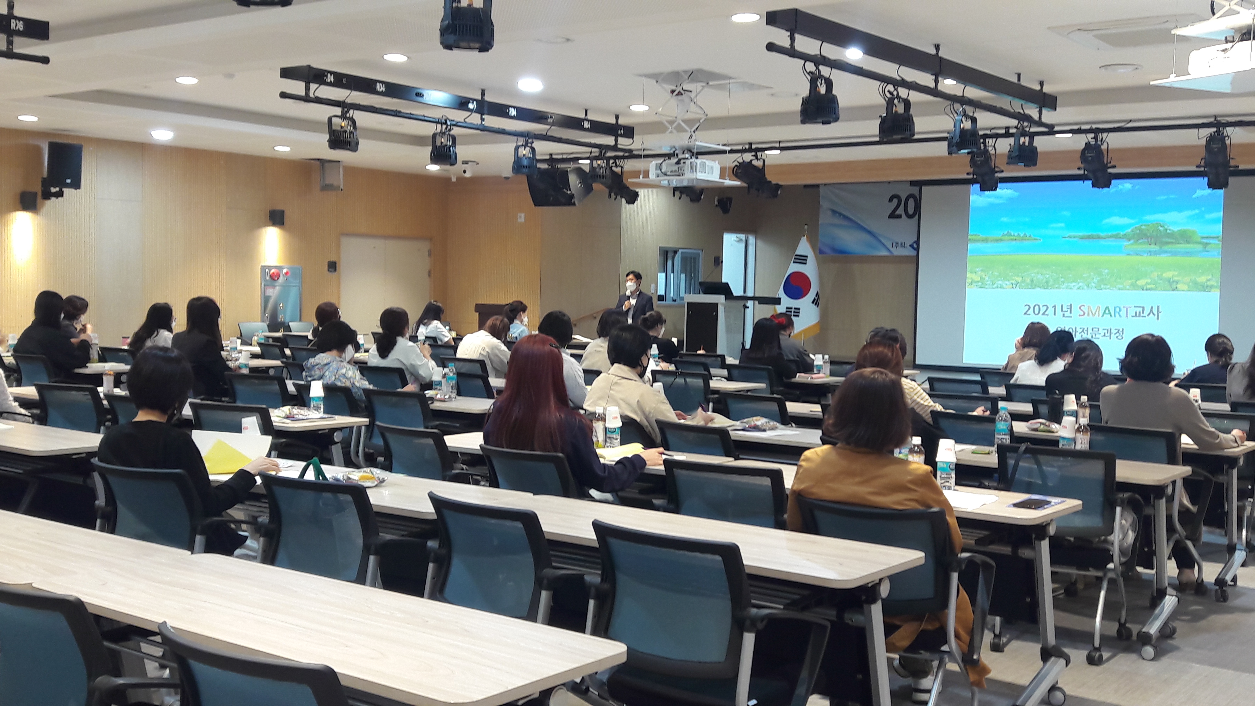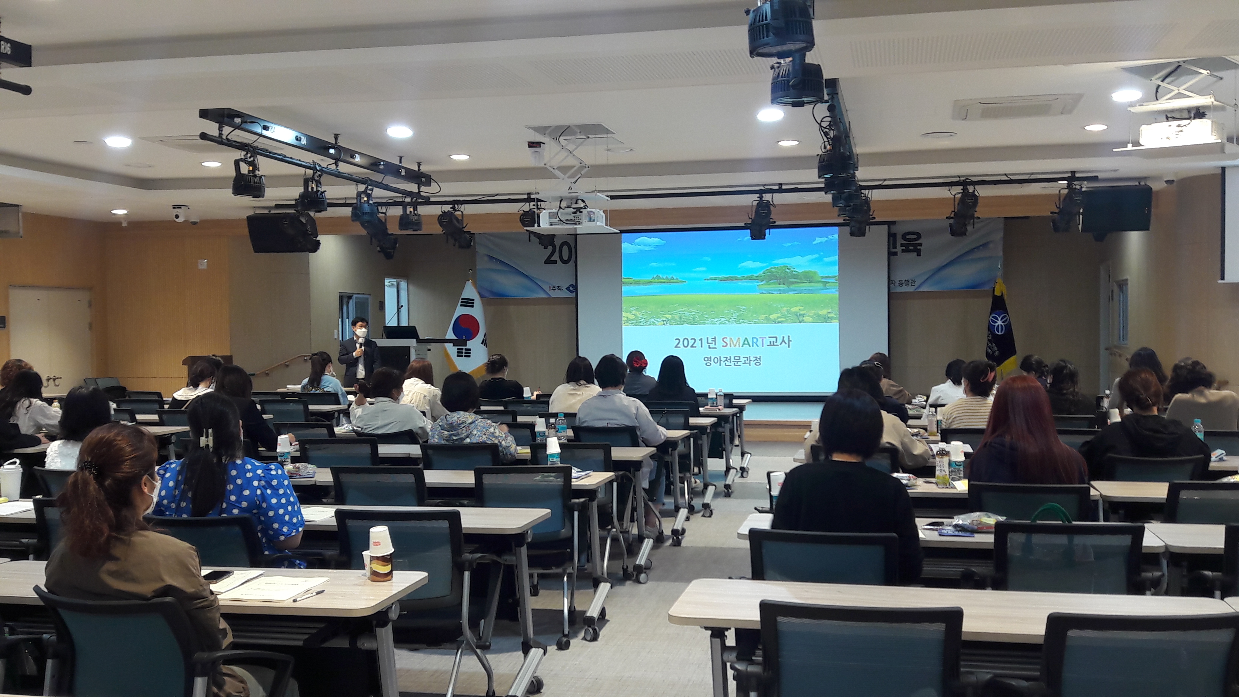 경북여성가족플라자 1층 동행관 다목적홀 강의실에서 50명 정도 모여 SMART교육을 진행하였습니다.