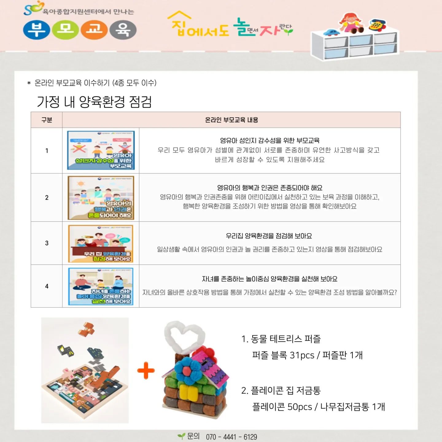 - 온라인 부모교육 및 놀이키트는 양육자 1명 당 1개 신청 가능합니다. (동일한 교육 중복 불가)