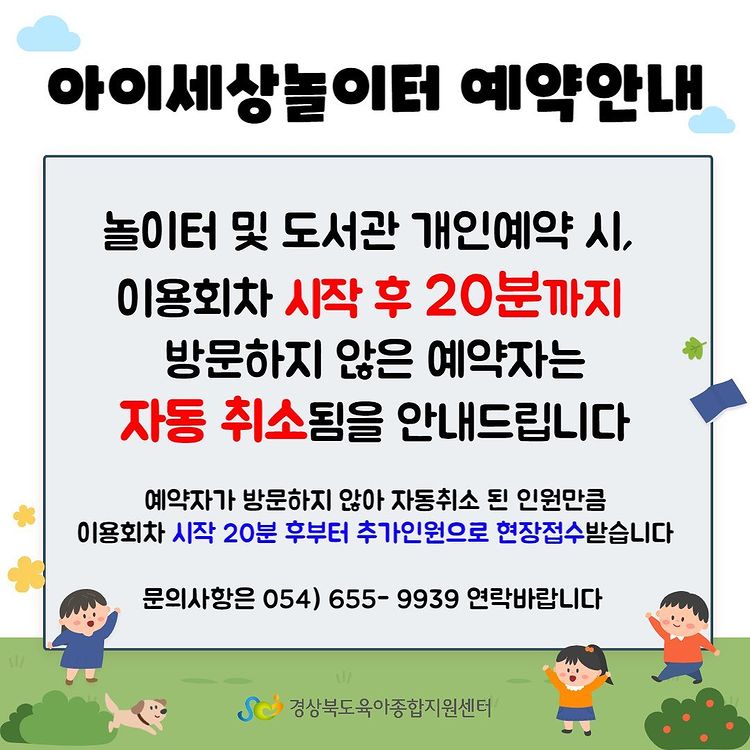 놀이터 및 도서관 예약 시, 이용회차 시작 후 20분까지 방문하지 않은 예약자는 자동취소됨을 안내드리며,