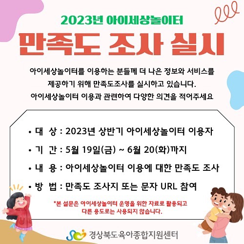 📣아이세상놀이터 이용하는 분들께 더 나은 정보와 서비스를 제공하기 위해 만족도조사를 실시합니다.