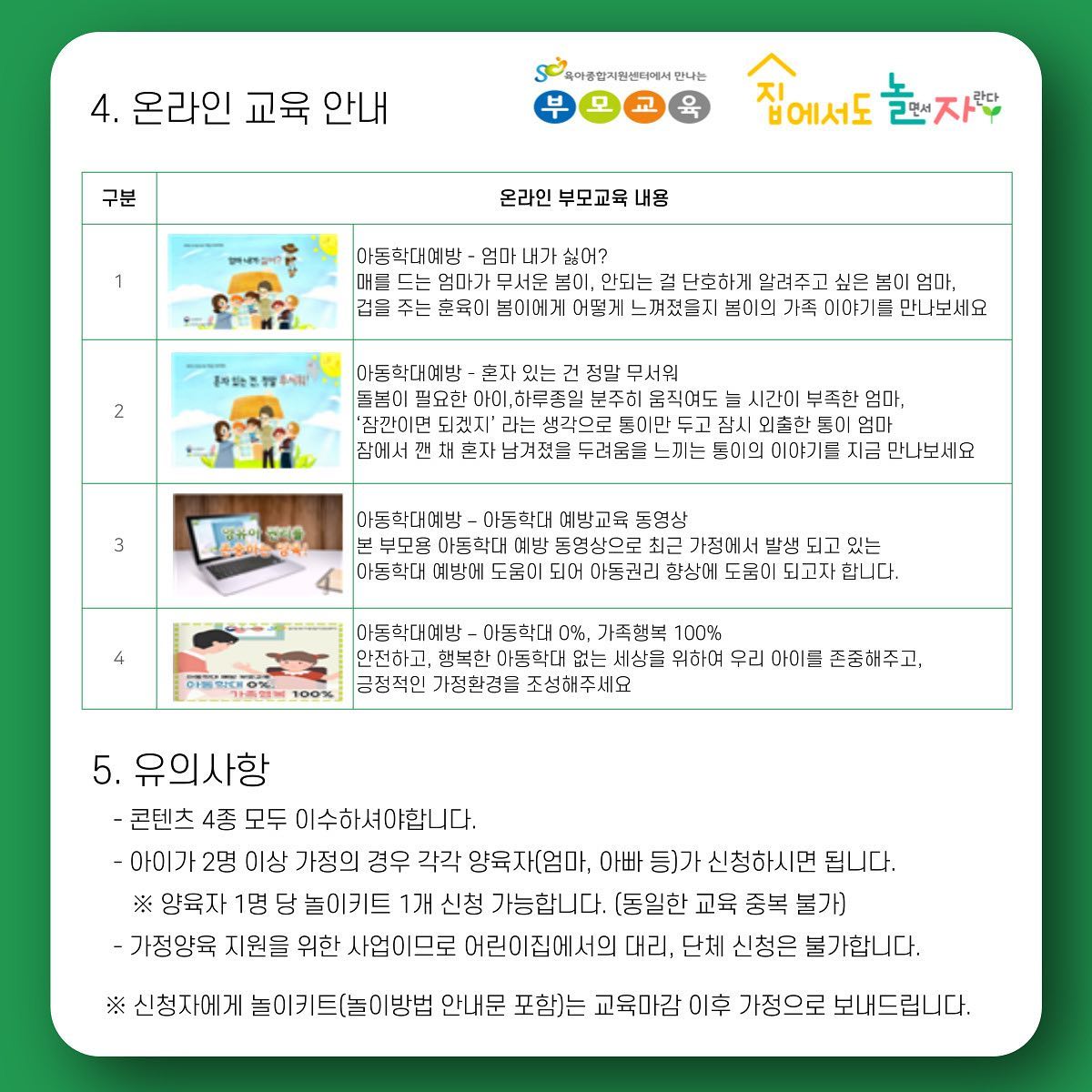 온라인 교육 수강 및 ’집에서도 놀(면서)자(란다)‘ 신청 바로가기 : http://bz.gbcare.or.kr/plecture/