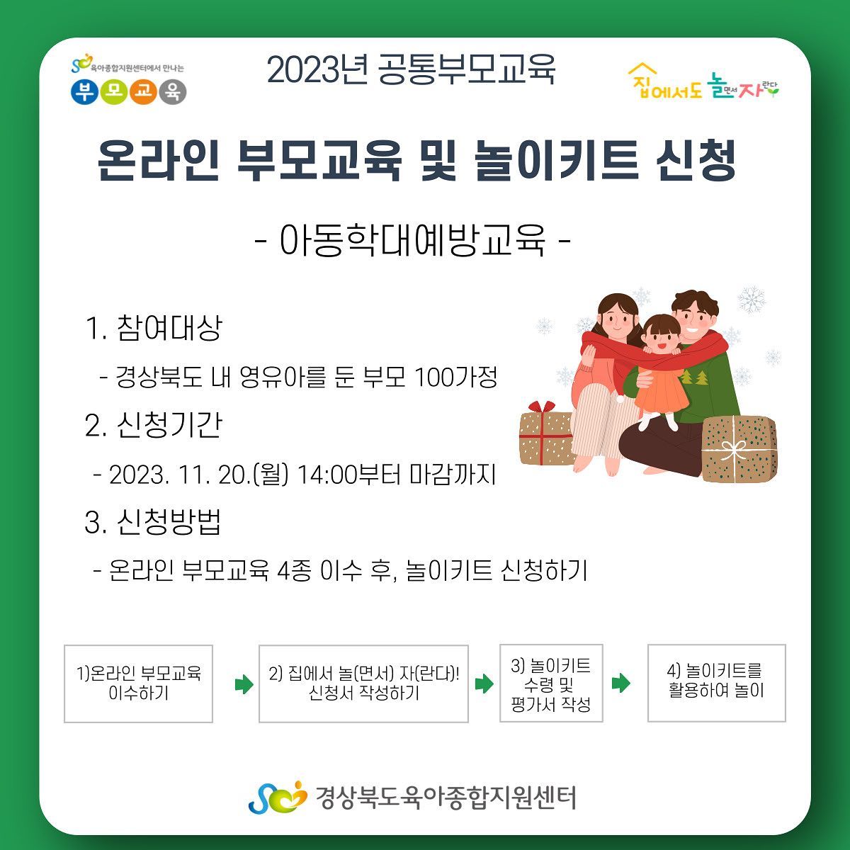 온라인 교육 수강 및 ’집에서도 놀(면서)자(란다)‘ 신청 바로가기 : http://bz.gbcare.or.kr/plecture/