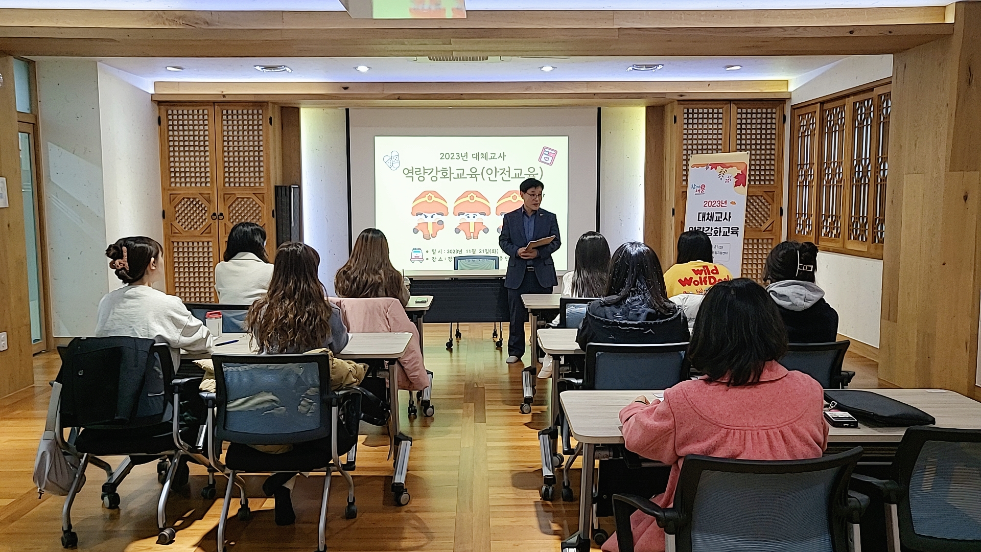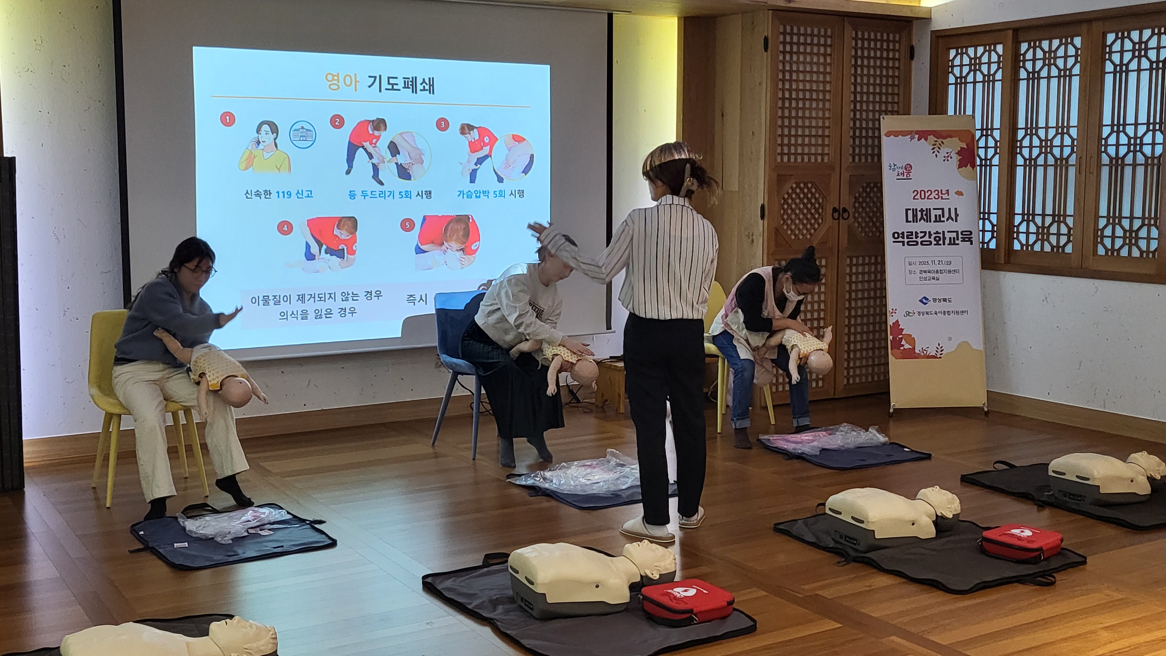 평가제 지표에 대한 내용을 숙지하여 보다 전문적인 역량을 갖출 수 있도록 지원하며, 대체 교사가 현장에서 발생할 수 있는 응급상황시 대처할 수 있는 행동요령 및 대처방법 등을 습득하기 위해 교육을 진행하였습니다.