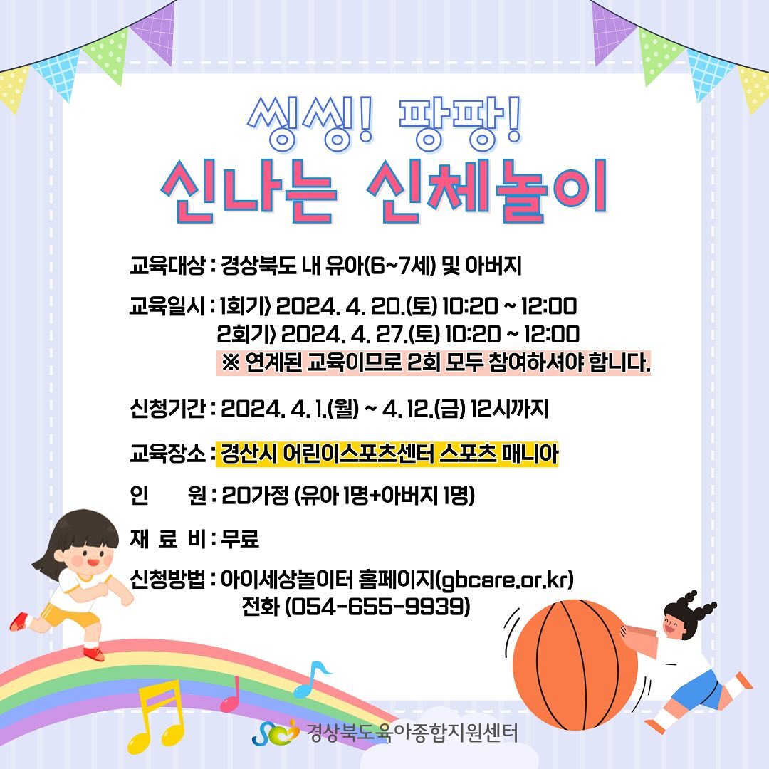 교육신청은 아이세상놀이터 홈페이지 -> https://www.gbcare.or.kr/ 또는 전화(054-655-9939)
