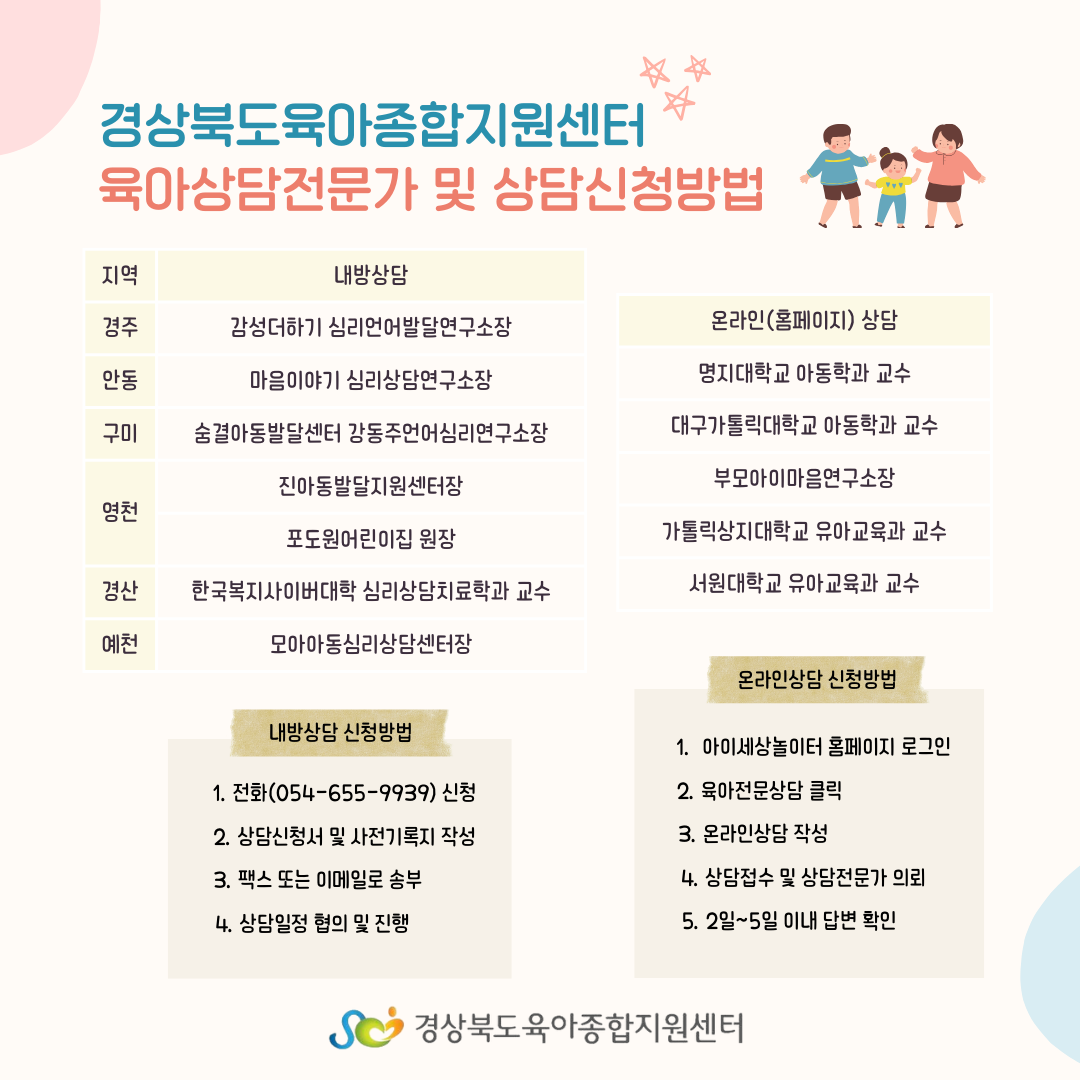 ✔상담장소 : 경북육아종합지원센터 1층 열린상담실, 경주, 안동, 구미, 영천, 경산지역 협약된 상담기관 상담실