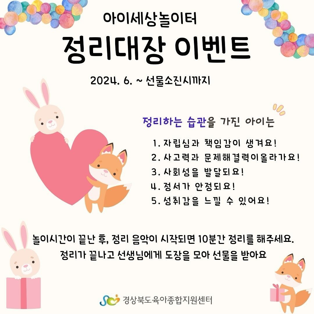 경상북도육아종합지원센터 아이세상놀이터에서는 영유아의 놀이 후 정리정돈의 중요성을 알리고 가정과 연계하여 영유아기에 적절한 발달을 돕고자 ’정리이벤트‘를 진행합니다^^ 우리 자녀들이 정리정돈 습관을 통해 영유아기에 긍정적인 발달이 이루어질 수 있도록 함께 도와주세요~!