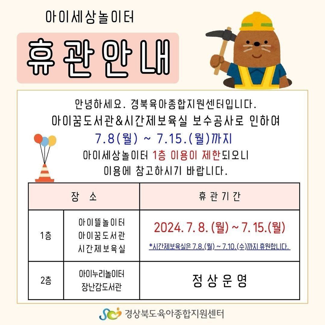 카테고리 없음 ⚠️아이세상놀이터 휴관안내 아이꿈도서관&시간제보육실 보수공사로 인하여 휴관합니다 by gbcare 2024. 7. 3. ⚠️아이세상놀이터 휴관안내 아이꿈도서관&시간제보육실 보수공사로 인하여 휴관합니다 이용에 참고바랍니다. 공유하기 게시글 관리 경상북도육아종합지원센터 공식 블로그 저작자표시 (새창열림) 댓글