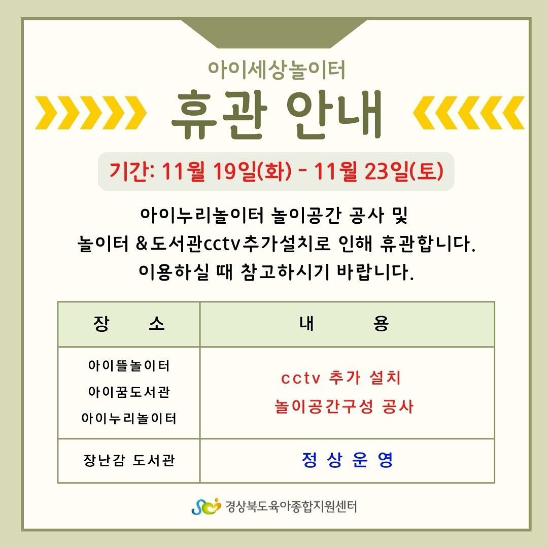 아이누리놀이터 놀이공간 공사 및 놀이터&도서관 cctv추가 설치로 인하여 휴관합니다. 이용하실때 일정 참고하시기바랍니다.