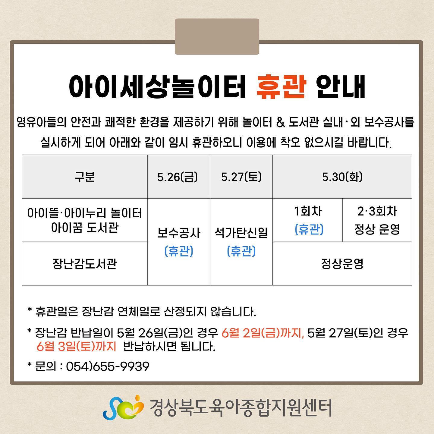 5월 26일 놀이터&도서관 보수공사를 실시하게 되어 임시휴관하오니 이용에 착오없으시길 바랍니다.