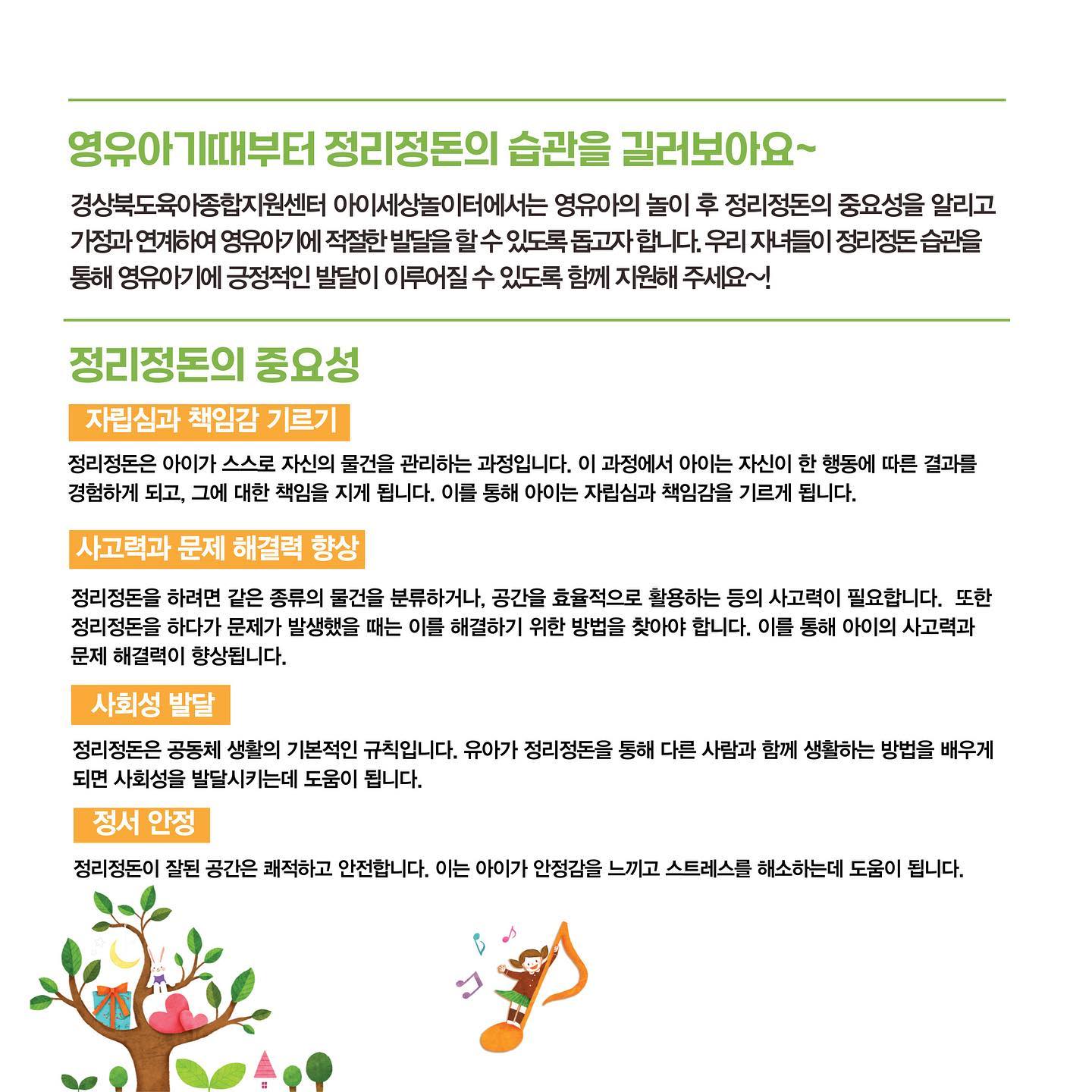 경상북도육아종합지원센터 아이세상놀이터에서는 영유아의 놀이 후 정리정돈의 중요성을 알리고 가정과 연계하여 영유아기에 적절한 발달을 돕고자 '정리이벤트'를 진행합니다^^ 우리 자녀들이 정리정돈 습관을 통해 영유아기에 긍정적인 발달이 이루어질 수 있도록 함께 도와주세요~!