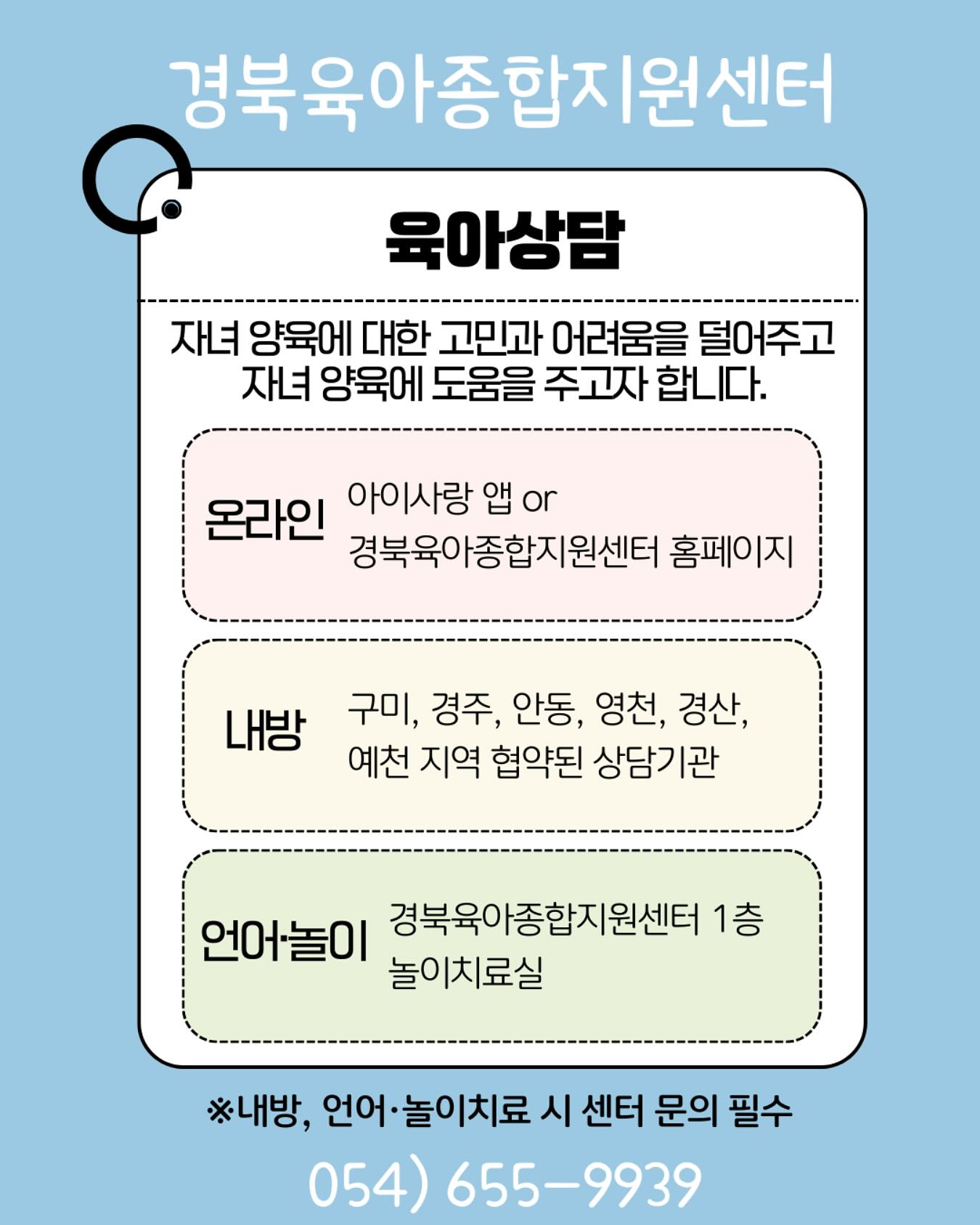 ✔상담장소 : 경북육아종합지원센터 1층 열린상담실 및 구미, 경주, 안동, 영천, 경산, 예천지역 협약된 상담기관 상담실